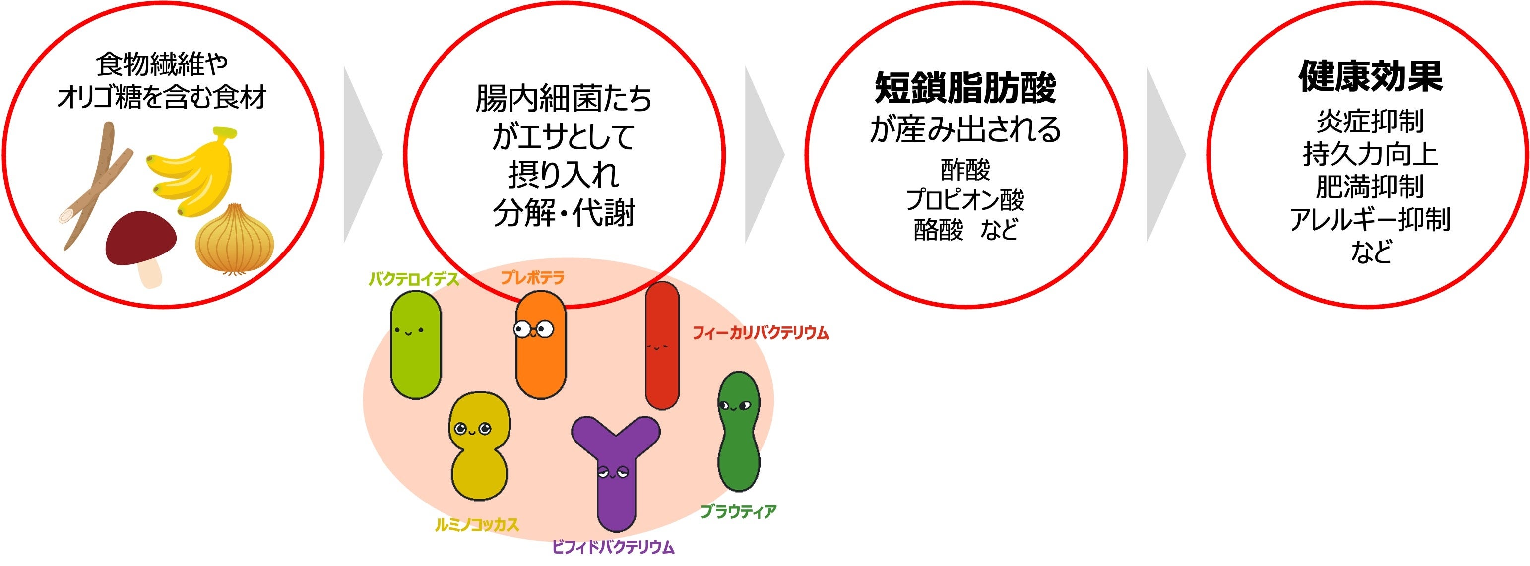 短鎖脂肪酸は、大腸内の腸内細菌が、食物の中に含まれる腸内細菌の“エサ”となる成分を取り込み分解し、代謝することでつくられる代謝物質の代表で、最新の腸内環境研究で注目されています。腸内細菌のエサとなるのは、主に食物繊維やオリゴ糖などを含む食材であることがわかっています。また、短鎖脂肪酸を産み出すメインプレイヤーとなる菌としては、 バクテロイデス 、 ルミノコッカス 、 プレボテラ 、 ビフィドバクテリウム 、 フィーカリバクテリウム 、 ブラウティア の6種類が日本人の腸内には多く棲んでいる傾向にあることがわかっています。効率よく短鎖脂肪酸を増やすためには、まずは 自身の腸内フローラを調べ、自分のメインプレイヤー菌を知り、その結果に合わせた食事を意識 することで、腸内細菌に最大限活躍してもらうことが重要です。