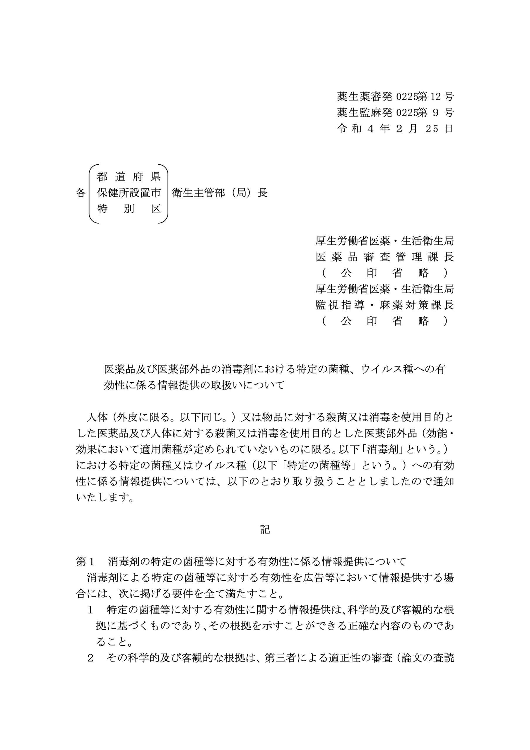 内容は「第三者による適正性の審査を経た根拠資料の提出」を条件に、特定の菌種・ウイルス種への有効性に関する情報提供を認めるというもの。つまり、明確なエビデンスを有する製品のみに、効果を示すことが許されたのだ。(画像は実際の通知文書)