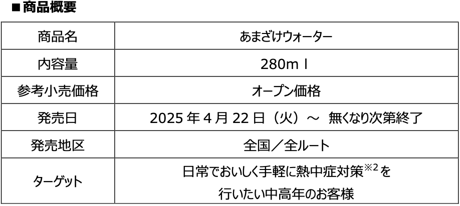 ※2:熱中症対策には適切な水分・塩分(ナトリウム)の補給が必要です。「あまざけウォーター」に含まれる塩分(ナトリウム)は全国清涼飲料連合会の「熱中症対策」表示ガイドラインの適用の範囲(食塩相当量0.1~0.2g/100ml)であり、 本製品は食塩相当量0.16g/100mlが含まれています。
