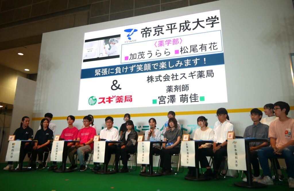 6校(城西大学/城西国際大学/帝京大学/帝京平成大学/東京薬科大学/日本薬科大学)とサポート6社(ウエルシア薬局/スギ薬局/ツルハHD/トモズ/マツキヨココカラ&㏇/龍生堂本店)が、現役薬剤師でも悩むような〇×問題に挑み、会場は薬学とドラッグストアにまつわるクイズは大いに盛り上がった。
