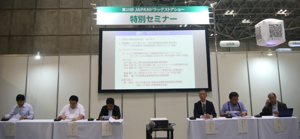 後半のパネルディスカッションでは座長にJACDS副会長で医薬品登録販売者委員会委員長の関伸治氏(セキ薬品会長)が就き、日登会専務理事の横田敏氏、パネリストにJACDS理事の田中元伸氏(くすりのコーエイ社長)、マツキヨココカラ&㏇の山内俊明氏、昭和女子大学グローバルビジネス学部教授の薬袋貴久氏に、山下氏を迎えて〝登録販売者がセルフケア・セルフメディケーションの受け皿になるために何が必要か問う〟について意見が交わされた。