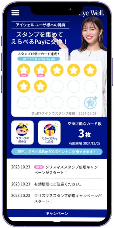 会員サイトでは「EyeWell」の購入レシート登録やレビュー投稿など、サイト内でスタンプを貯めることができ、貯まったスタンプはデジタルギフト「えらべるPay」に交換が可能。さらに、サイト内では初回登録特典として、初めて「EyeWell」の購入レシートを登録して、レシートが承認されると、500円分のスタンプを付与するキャンペーンも実施中。