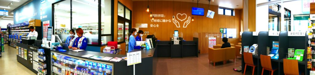 およそドラッグストアが対応可能な健康サービスを、開放的な窓口でシームレスに応需するカウンター上部には「『薬と栄養の専門家』がお客様の健康な暮らしをサポートします」とメッセージが掲げられている。