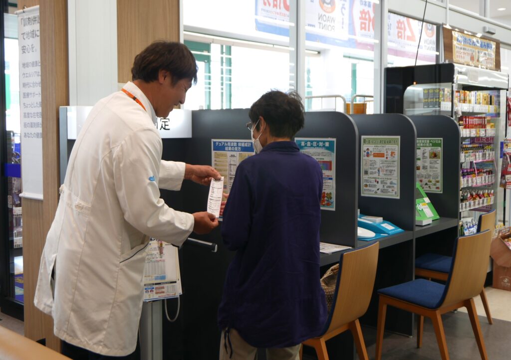 取材中に調剤待合室で処方薬を待つ高齢女性は、買い物を終えると「ケアカプセル」を体験していた。話をうかがうと「いつもは隣のSMで買い物をしている間にお薬ができるのを待っていたの。薬の情報は少し難しいけれど、食事や健康チェックは分かりやすいので、楽しいし、またやってみたい」と〝薬と栄養の専門家〟が提案するサービスに期待を寄せていた。