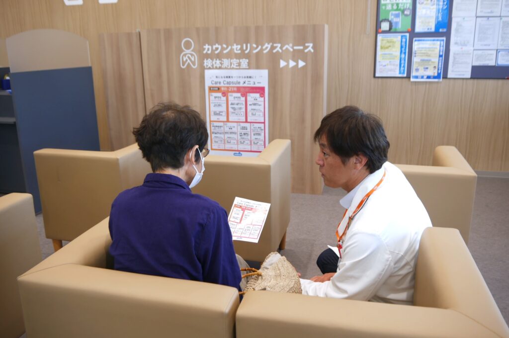 ドラッグストア業界が課題としている〝健康相談・検査サービスのマネタイズ〟について聞くと、「調剤カウンターが『ケアカプセル』の隣にあることで、相談や検査に対する信頼感・安心感が増しているように感じます。待合室にいらっしゃる患者様や、無料チェック機器を体験されているお客様に、しっかりと段階を踏んでご説明しご相談に応じています。店舗にある食品、レシピ提案、薬の悩みから栄養相談へのつながりなどが有機的に機能していると思います。40分ほど時間をかけて食事指導やカウンセリングを行っており、お客様の潜在的な栄養・健康ニーズに応えられていると感じます」と手ごたえを語ってくれた。