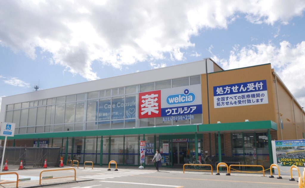 JR松本駅から徒歩10分ほど、国宝・松本城のお膝元に店舗を構える「ウエルシア松本渚店」は、ウエルシア薬局が今年3月に「ウエルシア イオンタウン幕張西店」でスタートした有料/無料のヘルスケアサービス「ケアカプセル」を実装した2店舗目。ロードサイドに位置する複合型商業施設「なぎさライフサイト」の一角にリニューアルオープンした。