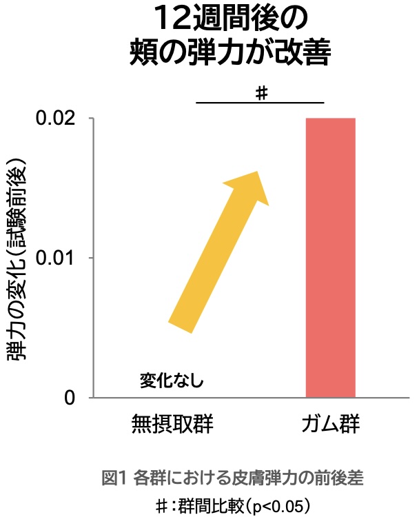 毎食前2粒×3回(1回あたり10分程度)を12週間ガム咀嚼トレーニングをすることで、無摂取群と比較しガム群の右頬の皮膚弾力性(R2:総弾性)が有意に増加した。皮膚の弾力性と老化の主要パラメータとして広く使用されているR2の有意な増加に加え、本来の状態に戻る力が強いと低値となるR1(振幅最小値)の有意な低下から、咀嚼トレーニングによる頬の弾力改善が示唆された。