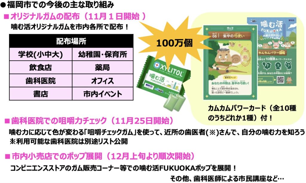 今回、 福岡市が目指す「人生100年時代。よく噛むことで日々の生活をもっと豊かに。」の実現を図ることを目的に、 福岡市、福岡市歯科医師会と三者協定を締結しました。福岡市とは2022年より「オーラルケア28プロジェクト」にて咀嚼力アップ事業で参画させていただいて以来、福岡100パートナーズ企業としても登録させていただくなど、多大なご縁を感じております。オーラルフレイル対策や、成人の方々を対象とした歯と口の健康啓発活動、幼児期の口腔機能の発達や歯の健康維持など、全年齢的な取り組みについて、ロッテ独自の強みや技術を活かし、皆様の健康づくりの推進に貢献したいと考えております。当社のサステナビリティ目標「ロッテ ミライチャレンジ 2048」では、「噛むこと」による健康増進の普及を目標のひとつに掲げており、「噛むこと」と健康に関する研究と啓発活動を推進しています。また、キシリトールを用いた幼児期の歯の健康維持などの活動にも取り組んでいます。