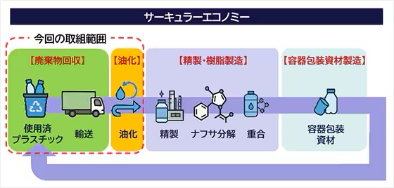 しょうゆなどの調味料を製造するキッコーマンフードテック株式会社西日本工場の製造工程で廃棄される包装資材やプラスチックボトル・キャップなどの廃プラスチックを回収し、CFP社の油化設備において分解・油化する。これにより、廃プラスチックを、食品容器包装資材の原料として再利用可能な「生成油」に変換し、資源として循環させることが可能になる。
