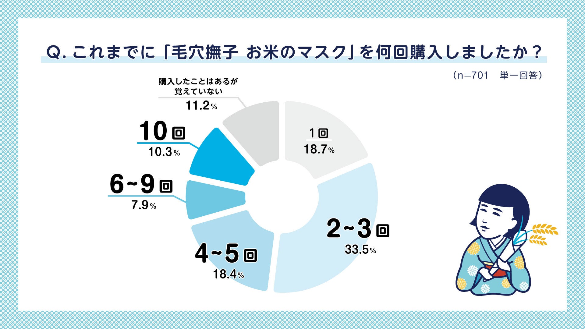 「お米のマスク」を2回以上購入していると回答した人が70.1%。全体の約7割がリピート購入していることがわかった。そのうち、10.3%の方が10回以上購入していると回答。根強いファンもいることが明らかとなっている。