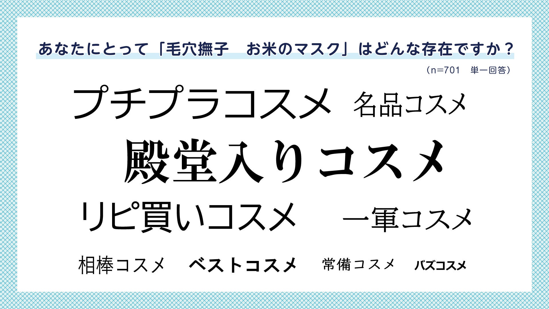 2回以上購入しているとリピート購入者701人に「お米のマスク」はどんな存在か質問したところ、主な回答は『殿堂入りコスメ』『プチプラコスメ』『リピ買いコスメ』となった。