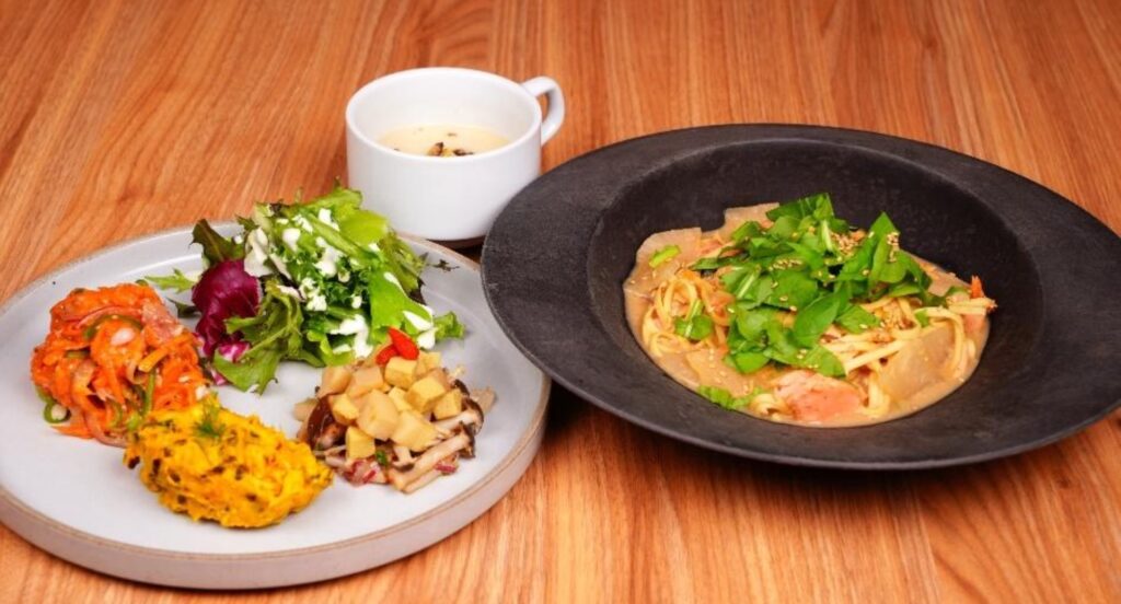 ・「おおさかEXPOヘルシーメニュー」基準を満たし、糖質も抑えた特別メニュー「秋鮭と大阪産ルッコラのSUNAOもっちりパスタ・季節のデリセット」の提供