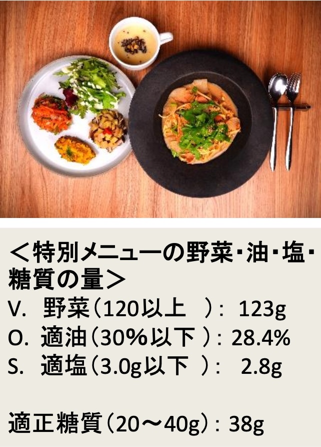 大阪府は、府民の健康寿命延伸をめざし、健康的な食環境整備の推進を目的に野菜・油・塩の量に配慮したヘルシーメニューとして「V.O.S.メニュー」を提唱している。主食とおかずを組み合わせたもので、下記の基準のうちすべてを満たすものを「V.O.S.メニュー」として承認しているす。さらに大阪・関西万博を記念して、その基準を満たしながら、大阪産(もん)と大阪グルメの要素を入れたものを「おおさかEXPOヘルシーメニュー」として承認している。