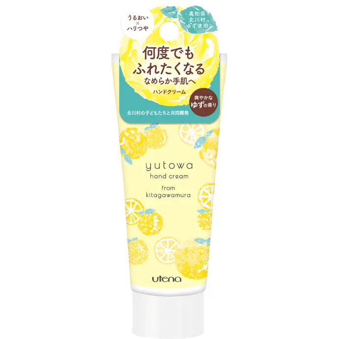 「ユトワ ハンドクリームB」は「生まれ育った村の魅力を多くの人に知ってほしい!」という熱い想いをもった、高知県北川村の公営探究塾に参加する子どもたちと化粧品メーカーのウテナ、ドラッグストアのウエルシアグループの共同開発商品。2023年、2024年に好評を博したハンドクリームをリニューアルするかたちで、共同開発第4弾として「ユトワ ハンドクリームB」の発売に至った。本来捨てるほかなかったゆずの種から抽出した「ユズ種子油」を保湿成分として配合。爽やかなゆずの香りを楽しみながら、乾燥しがちな手肌をしっとりとたもつ。