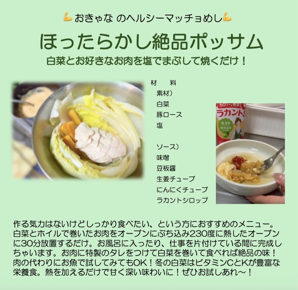さて、今回の「ヘルシーマッチョめし」は「ほったらかし絶品ポッサム」です。ザク切りの白菜とお好きなお肉をオーブンに入れて待つだけで完成です。味の決め手は自家製ソース!お味噌に豆板醤、生姜、にんにく、最後にカラントシロップを加えます。お肉にソースをつけて白菜で巻いて食べれば、栄養バランスに優れたご馳走になります。おキャナはここ最近毎日食べてるかも?皆さんもお試しあれ〜!