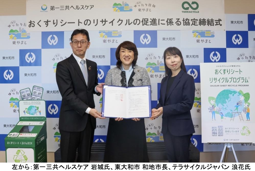 テラサイクルジャパン合同会社(浪花優子ジェネラルマネージャー)は、第一三共ヘルスケア株式会社(本内田高広社長)と協働し、2022年 10 月より横浜市内で展開している「おくすりシート リサイクルプログラム」の回収エリアを拡大し、 12 月 11 日(木)より東京都東大和市での回収を開始した。同日、当プログラムの開始にあたり東大和市役所庁舎にで東大和市、第一三共ヘルスケア社および当社の三者で、協定締結式を実施した。