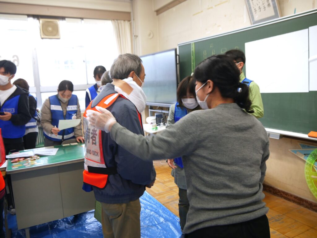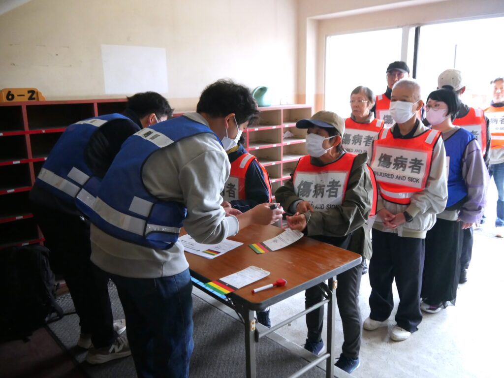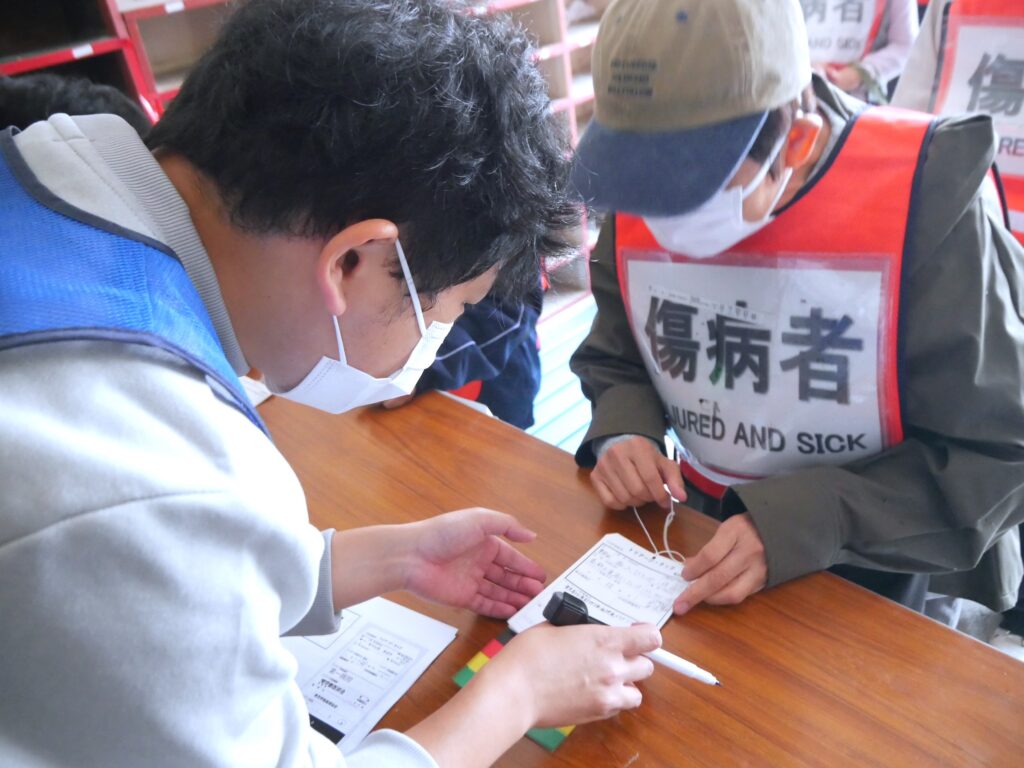 軽傷処置エリアで最も傷病者が詰めかけると予測された中之台小学校の「OTC」ブースには、JACDSから4名の薬剤師と2名の登録販売者がスタンバイした。軽傷の傷病者は受付で、住所・氏名・年齢・性別に加え、トリアージ実施場所・時刻・担当者、病名・症状、緊急性の区分を記載した「トリアージ・タッグ」が渡され、各ブースへと案内される。