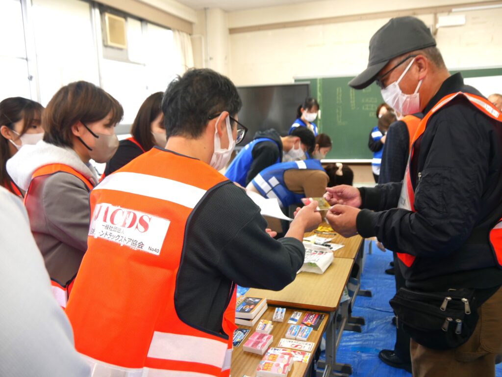 JACDSが担うのは、災害時に軽症者に必要とされるOTC医薬品の提供だ。救護所となる小学校の教室には「OTC」ブースが設置され、JACDSから派遣された薬剤師、登録販売者が軽症者の対応に当たる。必要に応じて薬剤師が近隣ドラッグストアにOTC医薬品を受け取りにいくシーンも想定され、訓練は緊張感に包まれた。