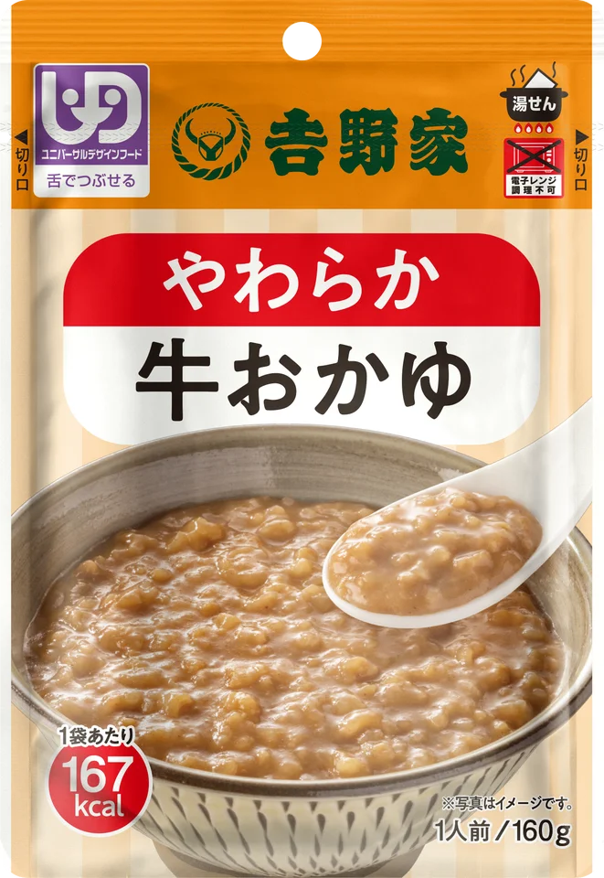 そして2025年10月からは、高まる介護ニーズを見据えて、吉野家の牛丼の美味しさを再現し、食べやすく、しかも塩分を抑えた介護食品も開発し、『吉野家のやさしいごはん®』シリーズの新商品『牛おかゆ』(日本介護食品協議会のユニバーサルデザインフード区分:舌でつぶせる)を発売しました。