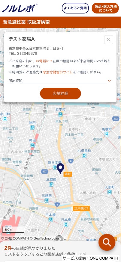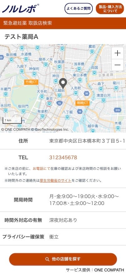 現在地や地名、駅名、住所から検索でき、店名、電話番号、販売可能な時間、時間外対応の有無とともに、個室の有無などプライバシー確保の状況を確認できる。