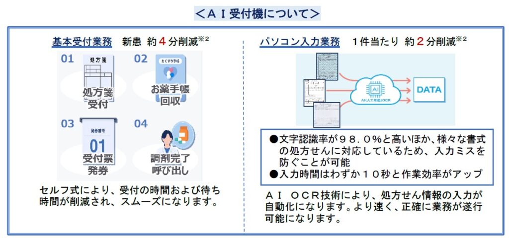 導入されるのは、株式会社くすりの窓口が開発したAI受付機。処方せんの読み取りから情報入力、紙のお薬手帳の回収、受付票の発行、調剤完了の呼び出しまでを対面不要で完結させる。