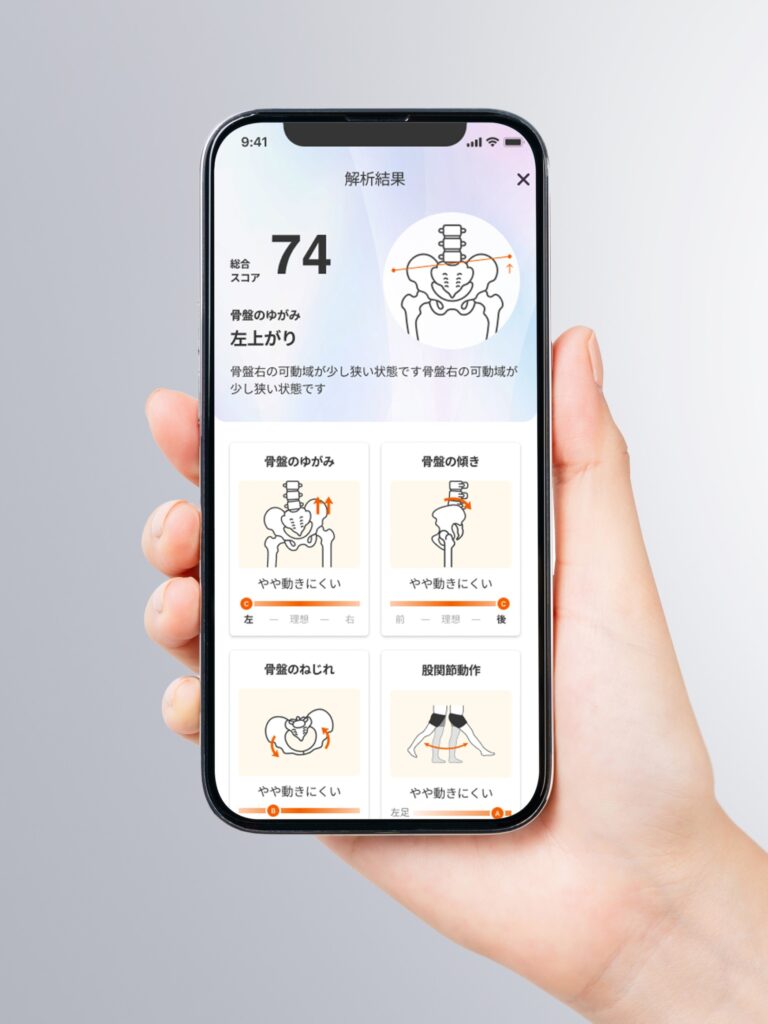 同アプリは、同社が長年蓄積した約2万人分の歩行データと独自アルゴリズムを活用。骨盤の傾きや関節動作など6項目を約20~30秒で定量化し、300通りの中から最適なエクササイズを提案する。
