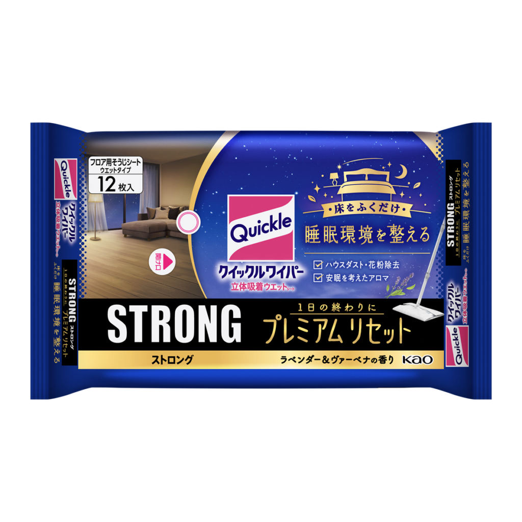 新製品は、同シリーズ史上最強のふき取り力を誇る「ストロング」シリーズの最新作。独自の立体構造シートにより、日中に蓄積し、夜間に舞い上がりがちなハウスダストや花粉をしっかり捕集・除去する。掃除機を使わず静かに清掃できる利点を活かし、就寝前のリビングや寝室での使用を想定している。