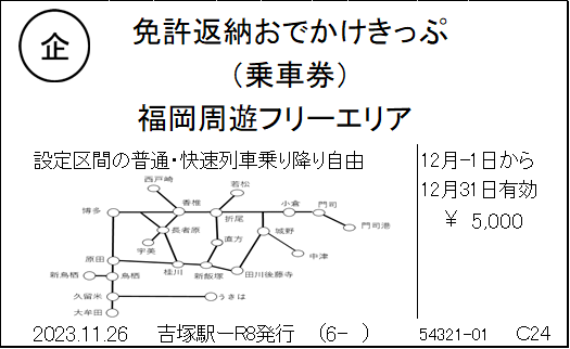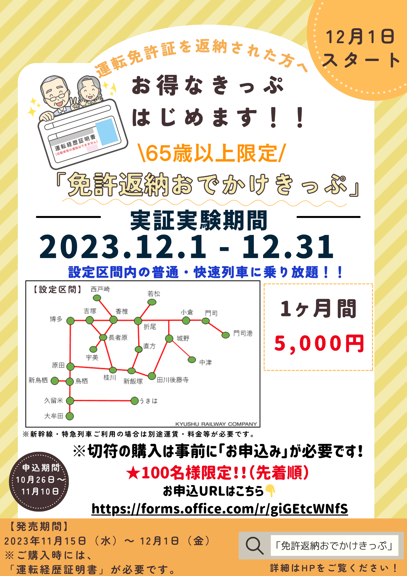 申込用紙ダウンロード:https://www.jrkyushu.co.jp/railway/ticket/menkyo_odekakekip.pdf